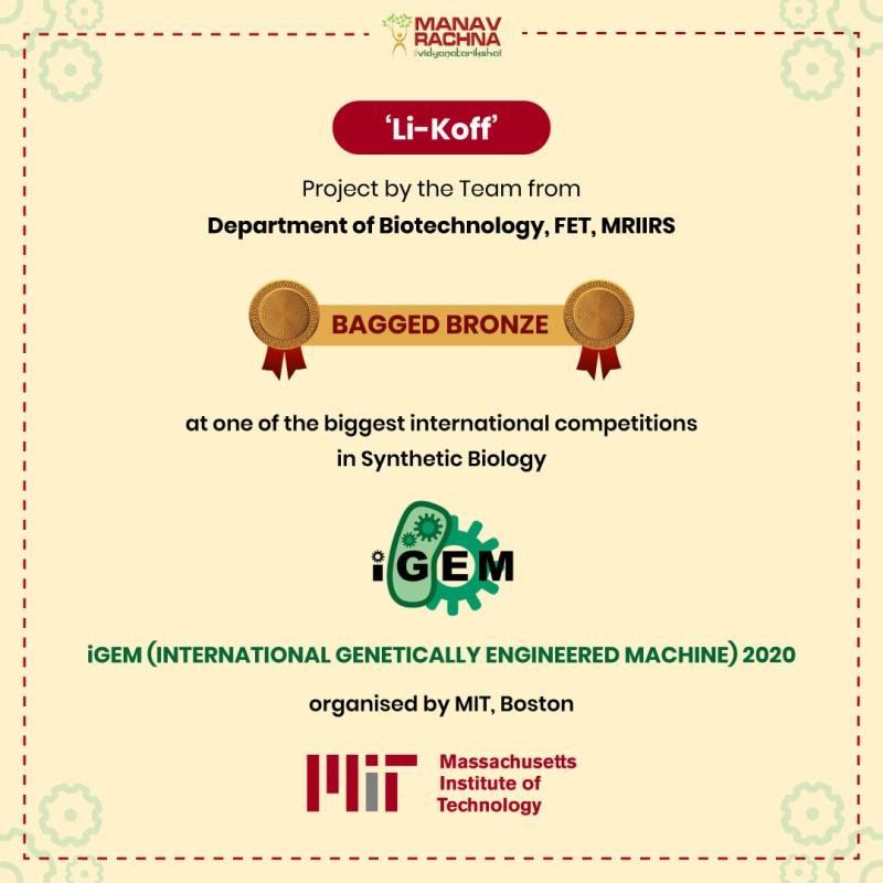A team of twelve students (10 from Dept of Biotechnology, FET, MRIIRS & 2 from the Dept of Computer Science & Engineering) under the mentorship of Dr. Kapila Kumar, Associate Prof., Department of Biotechnology, FET represented Manav Rachna at one of the biggest international competitions in Synthetic Biology- iGEM (INTERNATIONAL GENETICALLY ENGINEERED MACHINES) 2020 organised by MIT, Boston, USA. Their project Li-Koff that detects nitrogen-based pollutants using genetically engineered bacteria was selected by the DBT, Govt. of India through a rigorous selection process across the sub-continent. The team won iBEC (INDIAN BIOLOGICAL ENGINEERING COMPETITION) and was, therefore, fully sponsored by the Department of Biotechnology, Govt. of India for representing India at the International platform iGEM). The team is being led by Dr Kapila Kumar as the Principal Investigator. After all the hard work, the team secured a Bronze medal in the competition. The work, idea and proposed implementation by the team have been well appreciated by many scientists. The team story has been covered by The Better India, The Hans (publishing Media) & Radio Manav Rachna earlier.
