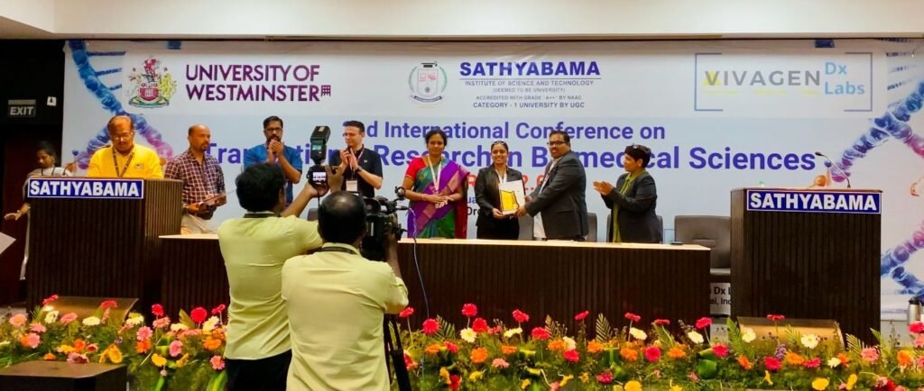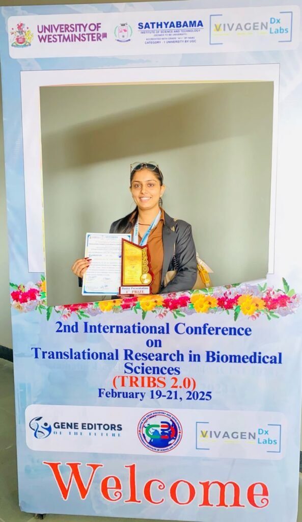Ms. Hasmeet Kaur, Research Assistant, MBRC participated in the 2nd International Comference on Translational Research in Biomedical Sciences (TRIBS 2.0) held from February 19–21, 2025, at Sathyabama Institute of Science and Technology, Chennai. Organized by the Centre for Drug Discovery and Development in collaboration with the University of Westminster, UK, the conference brought together experts from academia and industry. Hasmeet’s participation was marked by notable achievement, winning First Prize in the poster presentation competition. She also took part in the pre-conference workshop on CRISPR Gene Editing, gaining valuable hands-on experience. The event provided a rich platform for learning, networking, and exploring current trends in biotechnology and healthcare innovation.