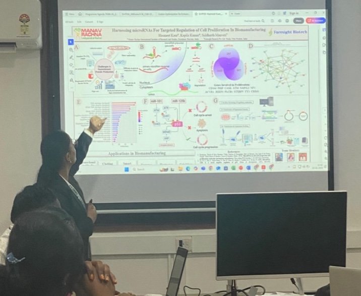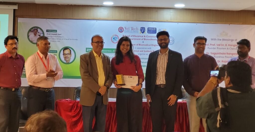 Dr. Kapila Kumar and Smriti Prajapati participated in the International Conference on Environmental, Chemical, and Synthetic Biology towards Sustainable Development Goals 2024 (ICECSSD-24) held at Vel Tech Rangarajan Dr. Sagunthala R&D Institute of Science and Technology, Chennai, from November 21–23, 2024. The event featured expert talks on synthetic biology, including genetic circuits and metabolic engineering. They presented a poster on Biological engineering of E.coli for detection of nitrosamines, earning second position in the competition. The final day included a hands-on workshop on designing guide RNAs for CRISPR-Cas13a, offering valuable practical insights.